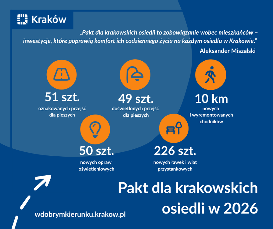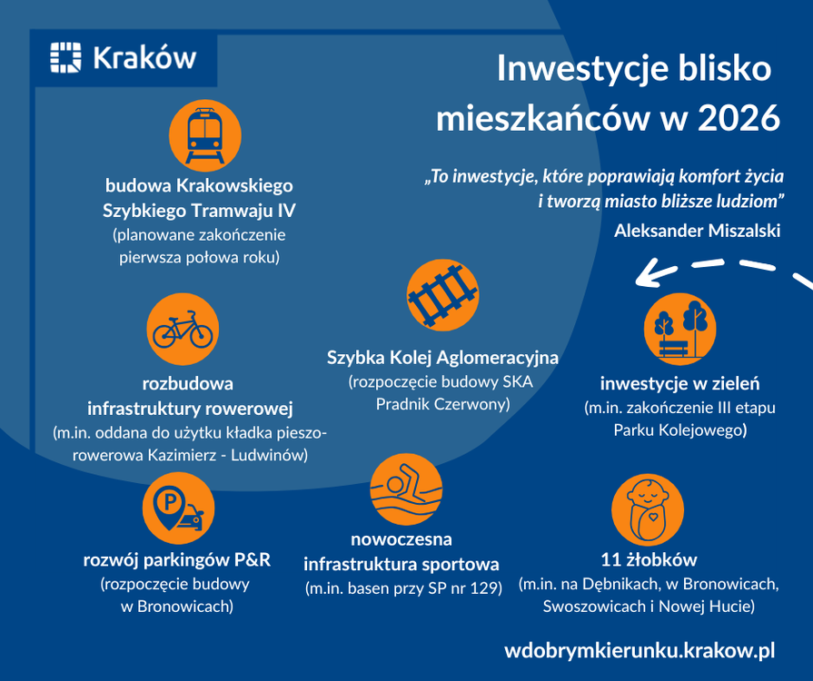 Rok 2026 upłynie w Krakowie pod znakiem zakończenia ważnych, oczekiwanych przez mieszkańców inwestycji, oraz rozpoczęcia kolejnych, które mają na celu poprawę komfortu życia Krakowian. Przed nami m.in. działania związane z przygotowaniami do budowy linii metra, a także inwestycje z listy Paktu dla krakowskich osiedli oraz inicjatywy „Da Się!”. A wszystko to dzięki programowi inwestycyjnemu, na który ogółem miasto zarezerwowało w tegorocznym budżecie ponad 1,5 mld zł. To rekordowa kwota.