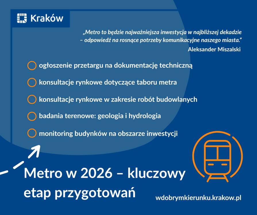 Kluczowym działaniem planowanym na 2026 r. jest ogłoszenie przetargu na przygotowanie dokumentacji technicznej metra, opartego na wynikach Studium kierunków rozwoju metra oraz Wstępnych Konsultacji Rynkowych dotyczących przyszłej dokumentacji technicznej, rozwiązań budowlanych i tunelowych oraz taboru metra. W 2026 r. rozpoczną się też badania terenowe obejmujące zagadnienia geologiczne, hydrologiczne, a także monitoring budynków.