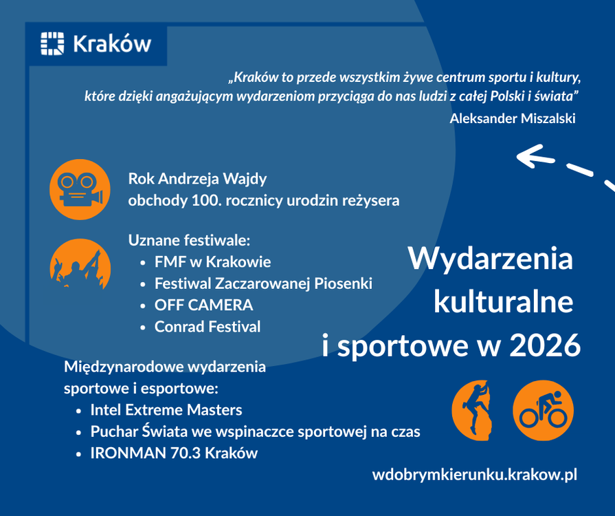Rok 2026 to także Rok Andrzeja Wajdy – w związku ze 100. rocznicą urodzin reżysera w Krakowie zaplanowano liczne wydarzenia kulturalne upamiętniające jego twórczość. Nie zabraknie również imprez na stałe wpisanych w miejski kalendarz, w tym m.in. Festiwalu Muzyki Filmowej, Festiwalu Zaczarowanej Piosenki, Festiwalu Kina Niezależnego Off Camera czy Festiwalu Conrada.