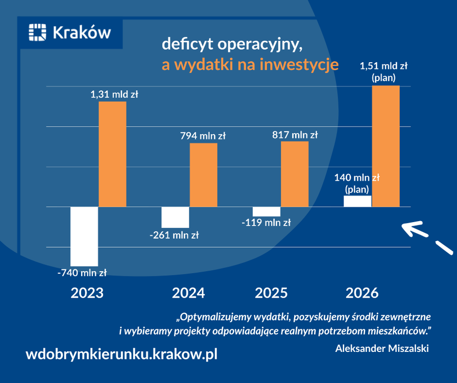 Celem tych działań jest wyjście z deficytu operacyjnego, a następnie budowa stabilnej nadwyżki operacyjnej (dodatniej różnicy między dochodami bieżącymi a wydatkami bieżącymi), która pozwoli zmniejszyć udział środków zwrotnych w inwestycjach (kredyty, pożyczki, emisja obligacji), czyli nie powiększać zadłużenia miasta. Prognozy na rok 2026 są optymistyczne, ponieważ analiza sprawozdań z wykonania budżetu za 2025 rok pokazuje, że Kraków konsekwentnie zmierza w kierunku wyzerowania ujemnego wyniku (w 2023 roku rekordowe -740 mln zł, w 2024 roku -261 mln zł). Rok 2025 zakończył się deficytem operacyjnym budżetu o wartości -119 mln zł, a w 2026 roku prognozowana jest już nadwyżka operacyjna, po raz pierwszy od wielu lat.